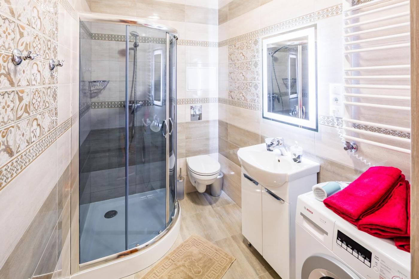 Two-Bedroom Apartment. The spacious apartment features 2 bedrooms and 1 bathroom with a walk-in shower and free toiletries. In the well-equipped kitchen, guests will find a stovetop, a refrigerator, kitchenware and a microwave. The apartment provides a flat-screen TV, a washing machine, a tea and coffee maker, a wardrobe as well as city views. The unit offers 2 beds.