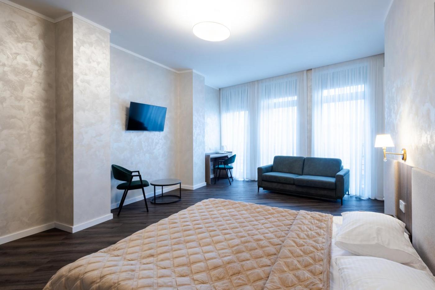 Deluxe Double Room with Balcony. Offering free toiletries, this double room includes a private bathroom with a shower, a hairdryer and slippers. The spacious air-conditioned double room offers a flat-screen TV with cable channels, a tea and coffee maker, a wardrobe, parquet floors as well as city views. The unit has 1 bed. ;